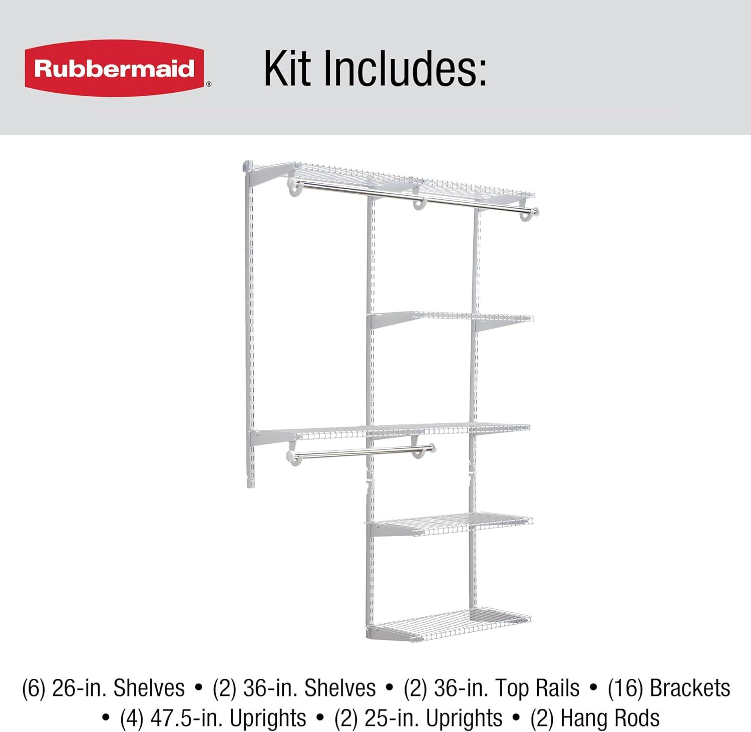 Make the most of your space with the Rubbermaid Configurations Closet Kits. Designed for better organization and maximizing space, this 3 to 6 ft. Deluxe Closet Kit includes shelves and rods that adjust for a custom fit. Get up to 18 ft. of shelving space and up to 10 ft. of hanging space when installed. Installation is simple without any cutting required so you can quickly and easily create a closet space that suits your needs. This closet set includes (6) 26-in. Shelves, (2) 36-in. Shelves, (2) 36-in. Top Rails, 16 Brackets, (4) 47.5-in. Uprights, (2) 25-in. Uprights, and (2) Hang Rods.