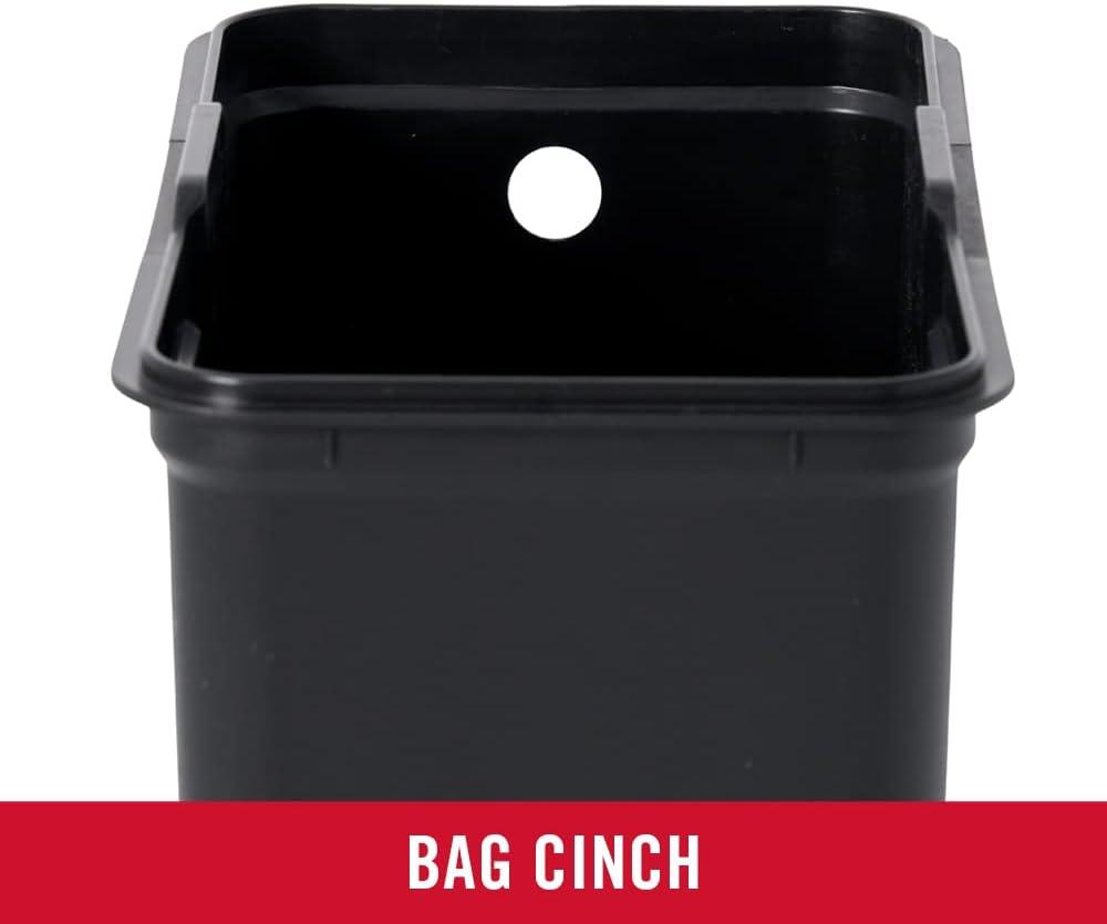 BAG CINCH: Secures standard liner bags to the top of the liner to prevent the bag from slipping.